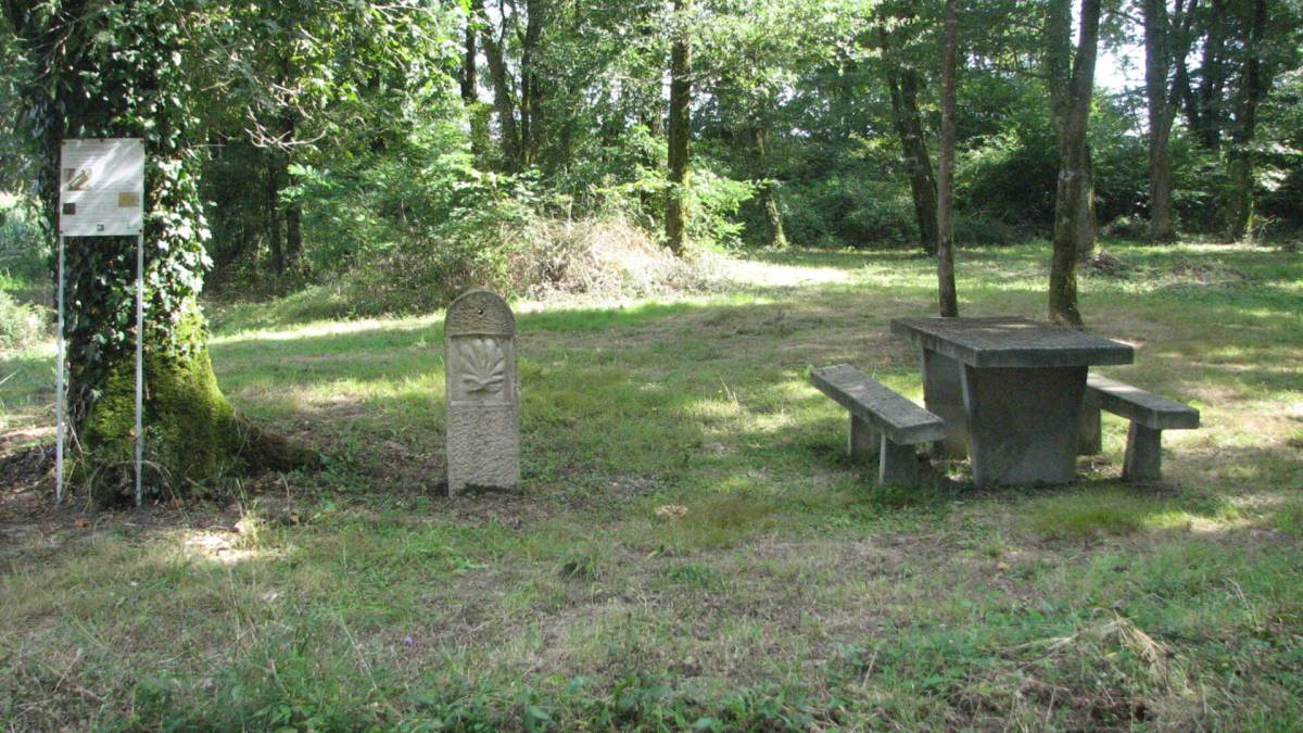 Une borne portant une coquille symbolisant le chemin de Saint-Jacques a été implantée sur le lieu.